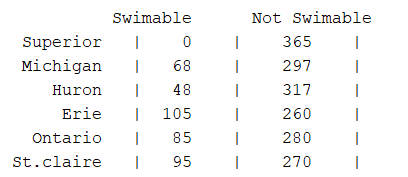 This graph is our favourite graph because we both enjoy swimming and it displays a clear comparison between the six lakes and where you can most comfortably swim. The six lakes in comparison are Lake Ontario, Lake Erie, Lake Huron, Lake Michigan, Lake Superior and Lake St.Clair. They are fairly close to each other and it provides an interesting outlook on the difference in average temperature between these six lakes. It is easy to understand and compare the percentage of time that each of the six lakes are above 20°C in 2018 and provides information for those who enjoy swimming as to which lake is warm most often. It can be useful to people who have other interests such as boats, cottages, and fishing and can help them make educated decisions. The following table displays how many days in each year that each of the six lakes are both swimmable and non-swimmable.