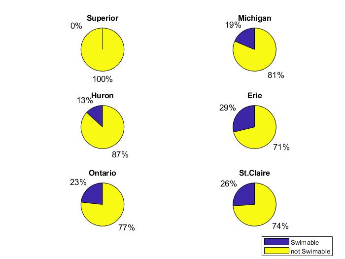 The pie charts conclude that Lake Superior is non-swimmable year around, Lake Michigan is swimmable 19% of the year and non-swimmable 81% of the year and Lake Huron is swimmable 13% of the year and non-swimmable 87% of the year. Lake Erie is swimmable 29% of the year and non-swimmable 71% of the year, while Lake Ontario is swimmable 23% of the year and non-swimmable 77% of the year. Finally, Lake St.Claire is swimmable 26% of the year and non-swimmable 74% of the year. Overall, this graph is clear, useful and well presented.